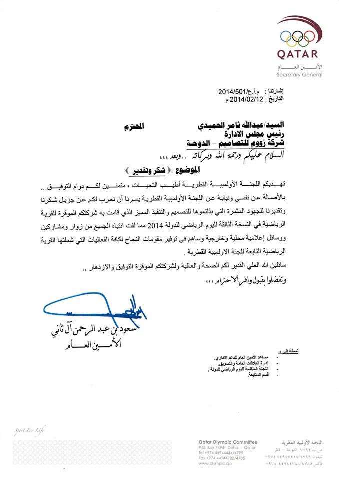 Appreciation Certificate from Qatar Olympic Committee for the highly dedicated efforts presented by Zoom during the 3rd edition of Qatar National Sport Day .