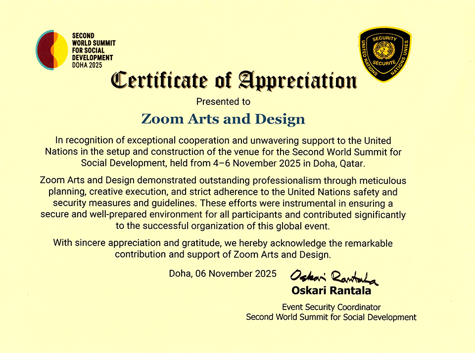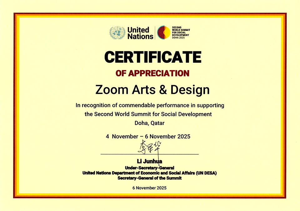 Zoom Arts & Design Receives UN Certificate of Appreciation at the Second World Summit for Social Development, Doha 2025